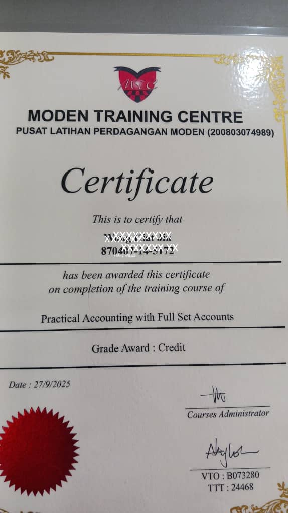 I help Admin/Accounts Clerk/Assistant/Fresh graduates, through my rapid grasp of practical Accounting skills training, After ~36 hrs training,achieve a career upgrade to another level, value added. Each month’s salary at least increase of RM300-RM800. Qualification and experience Certified Trainer (PSMB), Certificate in Accounting, Tax Management/Advanced Tax Management, Business Management etc. Accounts Dept head b4. More than 20+years in handle company’s full set accounts etc. 1998-2025 Master Trainer at Pusat Latihan Perdagangan Moden. -Has helped more than 4,000+ students